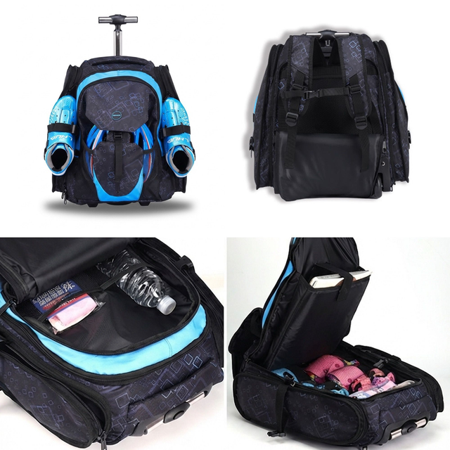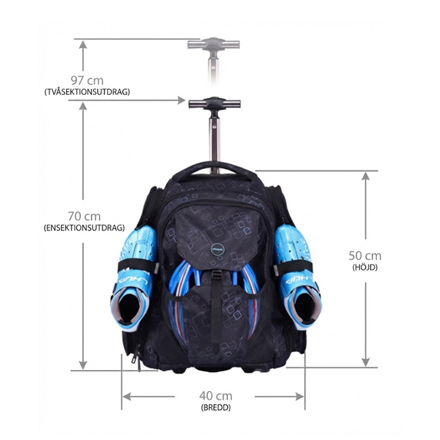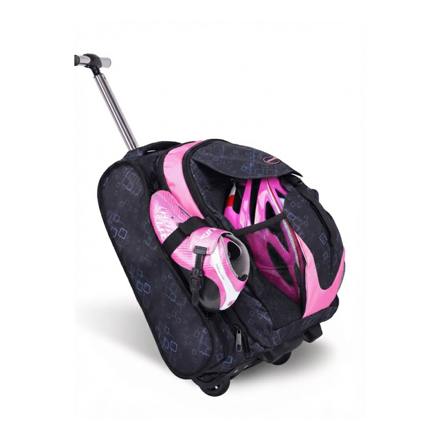 Gör vägen till ishallen lättare – rulla din utrustning i stället för att bära den. Den här rullande skridskoväskan är designad för barn och vuxna som tränar ofta. Med tre separata fack får du plats med skridskor, hjälm, skydd och ombyteskläder utan att allt blandas. Passar både skridskor, inlines och rullskridskor.